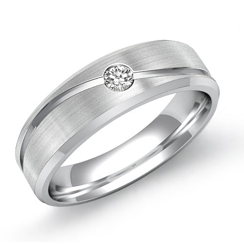 The dazzling curve design men's diamond half wedding band is made from . Featuring polished beveled edge and matte finished center with curve design and 14k Gold White round diamond in a bezel setting.