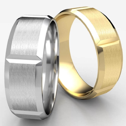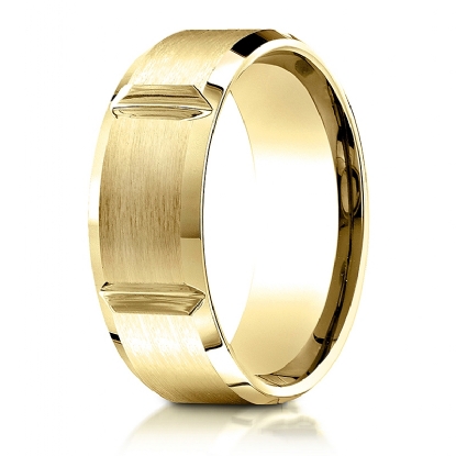 This unisex 8mm comfort fit verticle grooved carved design wedding band features satin finished and high polish beveled edges. This sleek and fashionable wedding band is comfortable to wear for men's and women's, this band is made from quality 14k white gold. Available in white gold, yellow gold and rose gold.