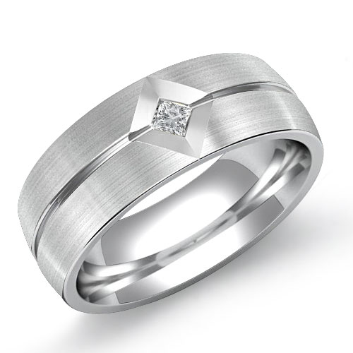 Luxurious & romantic matte men's kite set diamond half wedding band is made from solid 14k Gold White. Featuring matte finished and center grooved with bezel set princess cut diamond set in a kite shape. Ready for pickup in 5-10 business days or Ships in 2 weeks