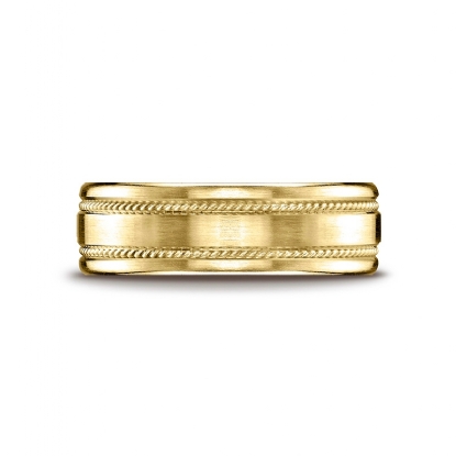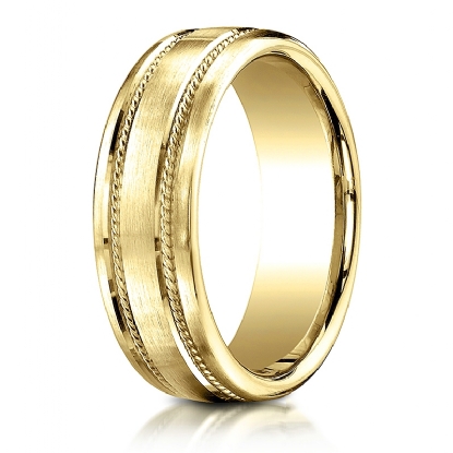 This 7.5mm classic comfort fit satin finished wedding band accented with two off-center rope details and rounded edges. The quality comfort fit 14k Gold Yellow men's wedding band is long lasting and perfect for everyday wear. Available in white gold, yellow gold and rose gold.