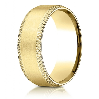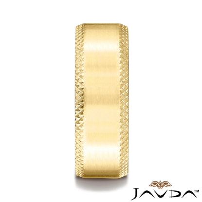 This comfort fit carved wedding band features satin finished center with a beveled cross hatched edges. The dazzling unisex wedding band is made from quality 14k Gold Yellow, measures 8mm wide. An exquisite hatched detail makes this ring truly extraordinary for men's and women's. Available in white gold, yellow gold and rose gold.