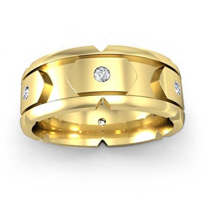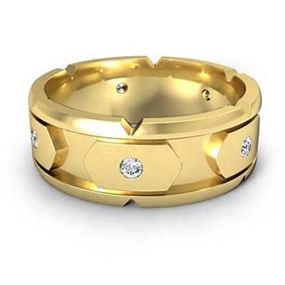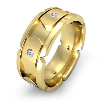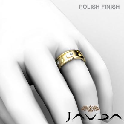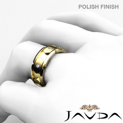 An elegant and unique men's diamond eternity wedding band is made from solid 14k Gold Yellow. This designer ring features polished finished with round diamond in a bezel setting.
