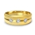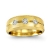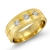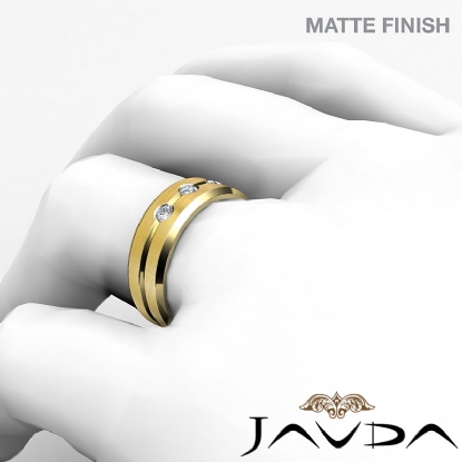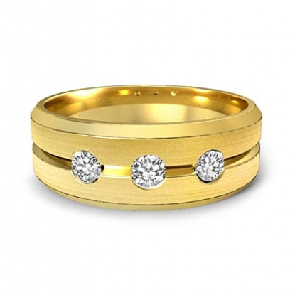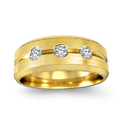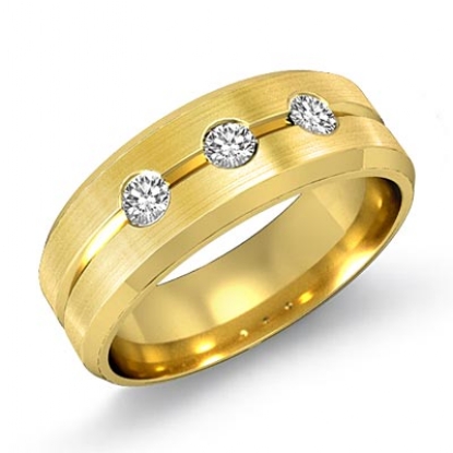 An eye-catching classic 3 stone diamond men's half wedding band is made from solid 14k Gold Yellow. Featuring polished beveled edges and matte finished center grooved with round 3 stone diamonds in a bezel setting.