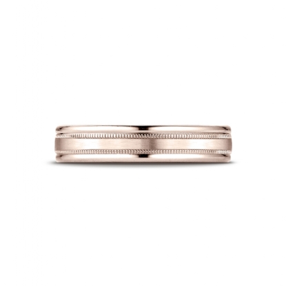 This classic 4mm comfort fit carved wedding band features a satin finished center along with milgrain and high polished round edge. The quality 14k Rose Gold Unisex wedding band is durable and comfortable to wear everyday. This ring is symbolizes the stength of marriage, the craftsmanship of this band is truly remarkable. Available in white gold, yellow gold and rose gold.