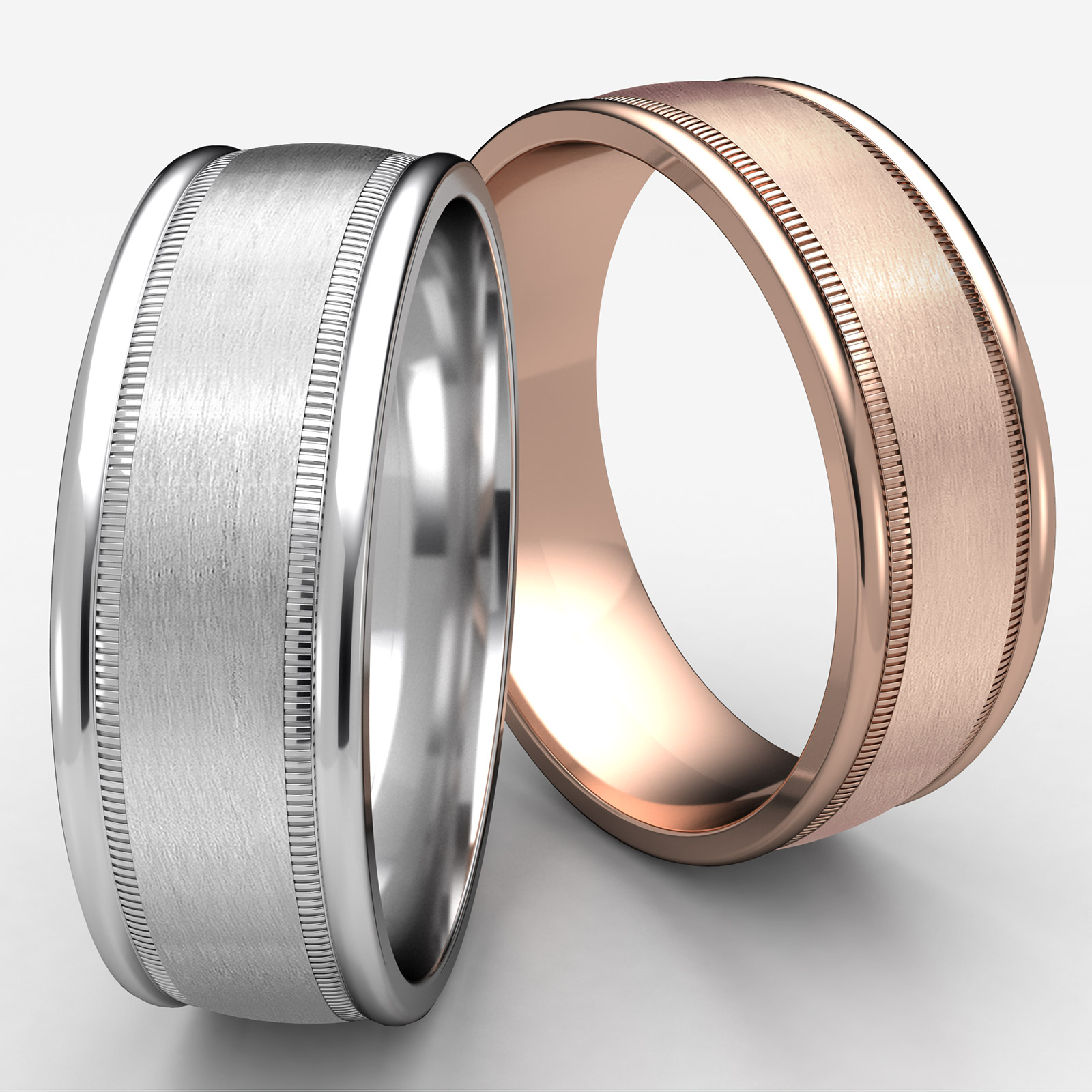 This comfort fit unisex carved wedding band features a satin finished center along with milgrain detailing and high polished round edge. The bold width band measures 8mm wide and made from 14k Rose Gold. This high quality gold wedding ring for men's and women's is durable and fits comfortably. Available in white gold, yellow gold and rose gold.