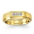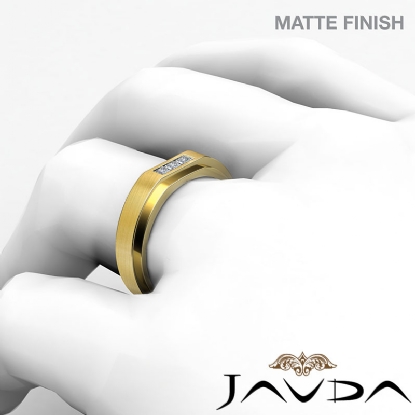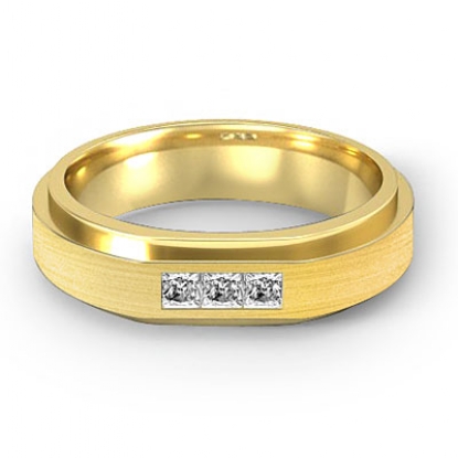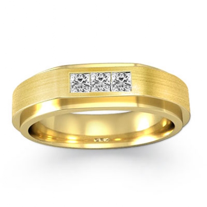 A classic handsome diamond men's half wedding band is made from solid 18k Gold Yellow. Featuring polished flat edge and matte finish center with 3 stone princess cut diamond in a channel set.