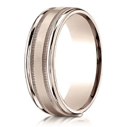 This unisex comfort fit carved wedding band features a satin finished center along with milgrain detailing and high polished round edge. The band is made from 14k Rose Gold, measures 7mm wide. This high quality gold wedding ring for men's & women's is long lasting and fits comfortably. Available in white gold, yellow gold and rose gold.