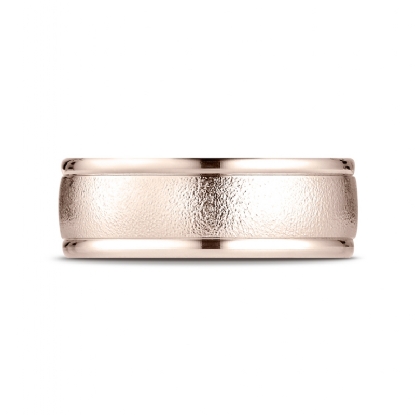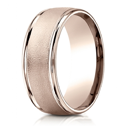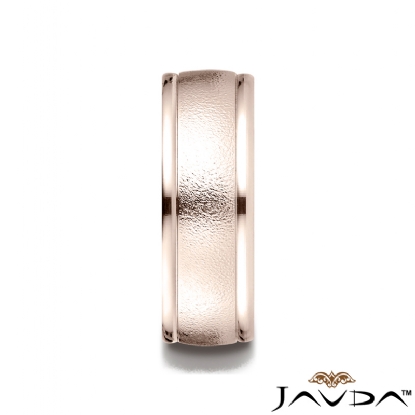 This 8mm handsome comfort fit men's wedding band features a wire brushed finished along the center and a high polished round edges. The stunning ring is made from 14k Rose Gold and it is comfortable to wear everyday. This stylish and classic quality gold wedding ring is long lasting. Available in white gold, yellow gold and rose gold.