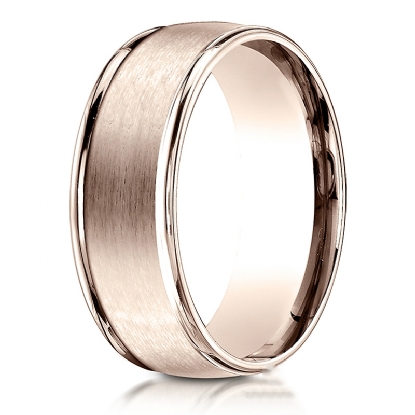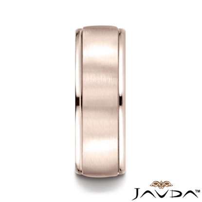 This luxurious comfort fit unisex wedding band features a satin finished along the center with high polished round edges. The gorgeous wedding ring is made from quality 14k Rose Gold and it is comfortable to wear everyday, measures 8mm wide. This classic gold wedding band for men's and women's is long lasting. Available in white gold, yellow gold and rose gold.