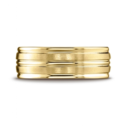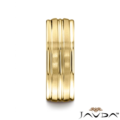 This comfort fit 8mm unisex satin finished carved design wedding band features a center groove and high polished round edges. The bold width gold wedding band for men's and women's symbolizes everlasting love. This incredible band is made from quality 14k Gold Yellow. Available in white gold, yellow gold and rose gold.