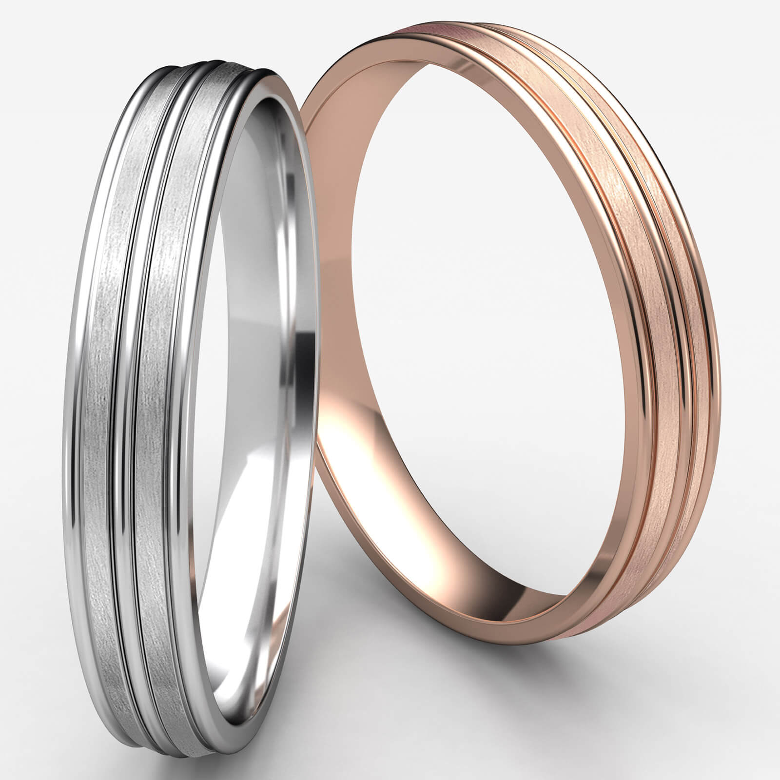 This stylish comfort fit 4mm unisex carved design wedding band features a double grooved satin finished with high polished round edges. The classic gold wedding band for men's and women's is comfortable to wear everyday. This incredible band is made from quality 14k Rose Gold. Available in white gold, yellow gold and rose gold.