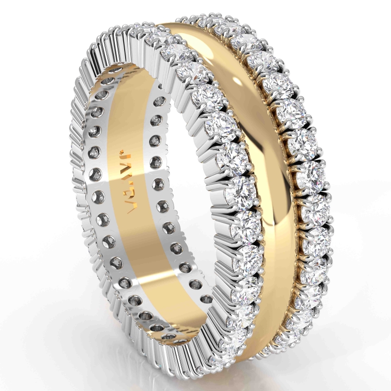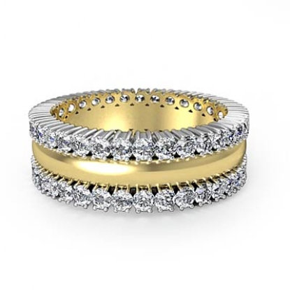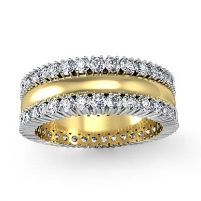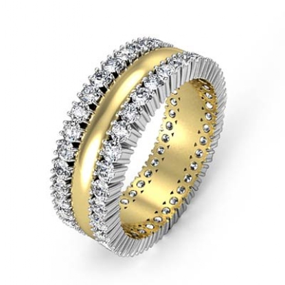 Traditional yet sophisticated prong set men's diamond eternity wedding band is made from solid 18k Gold 2Tone. Featuring yellow gold center dome and round diamonds beautifully set with white gold prong detailing gives it a stylish look.