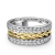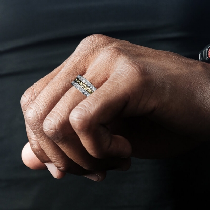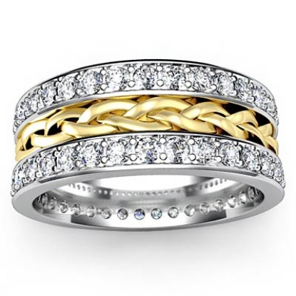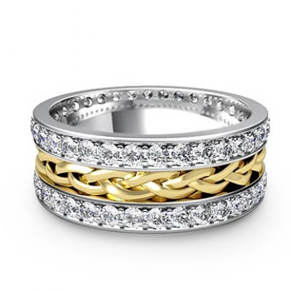 A handmade braided design men's diamond eternity wedding band is made from 18k Gold 2Tone. Featuring yellow gold braided design in the center and pave set round diamonds beautifully set with white gold.