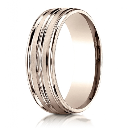 This amazing comfort fit unisex carved design wedding band features a grooved satin finished center with high polished round edges. The classic gold wedding band for men's and women's is comfortable to wear everyday. This incredible band is made from quality 14k Rose Gold, measures 7mm wide. Available in white gold, yellow gold and rose gold.