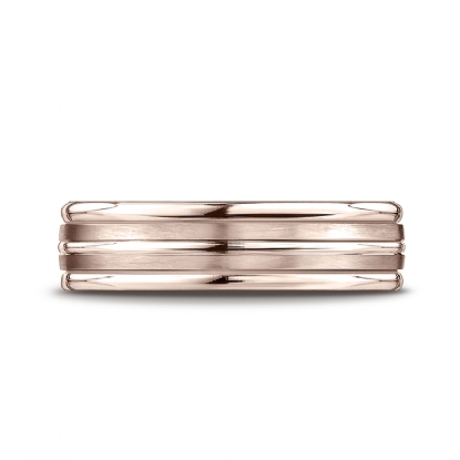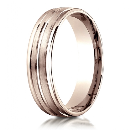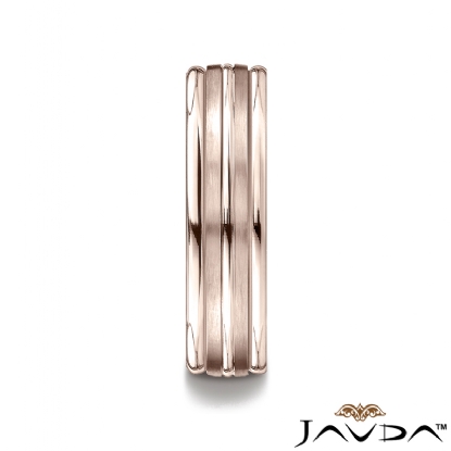 This remarkable 6mm unisex carved design wedding band features a grooved satin finished center trim with high polished round edges. The comfort fit gold wedding band for men's and women's is comfortable to wear everyday. This incredible band is made from quality 14k Rose Gold, measures 6mm wide. Available in white gold, yellow gold and rose gold.