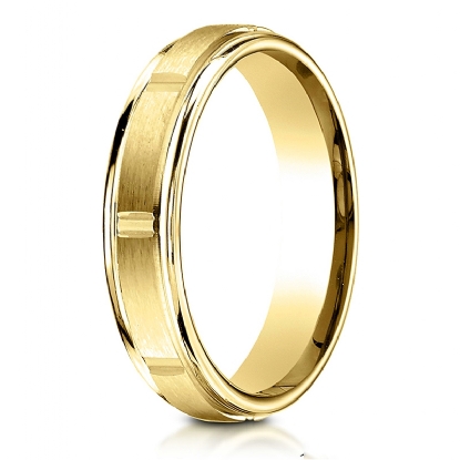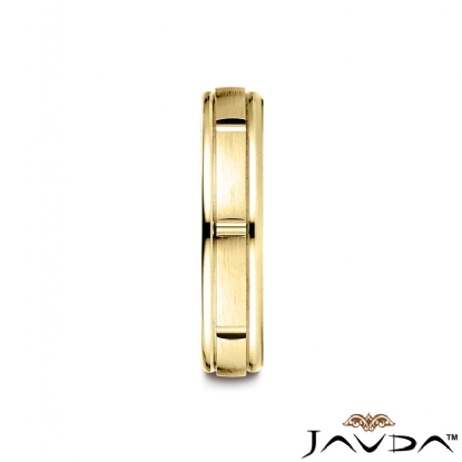An elegant 4mm unisex comfort fit carved design wedding band features a satin finished verticle center cuts with high polished round edges. The stylish and classic gold wedding ring for men's and women's is comfortable to wear everyday. This incredible band is made from quality 14k Gold Yellow. Available in white gold, yellow gold and rose gold.