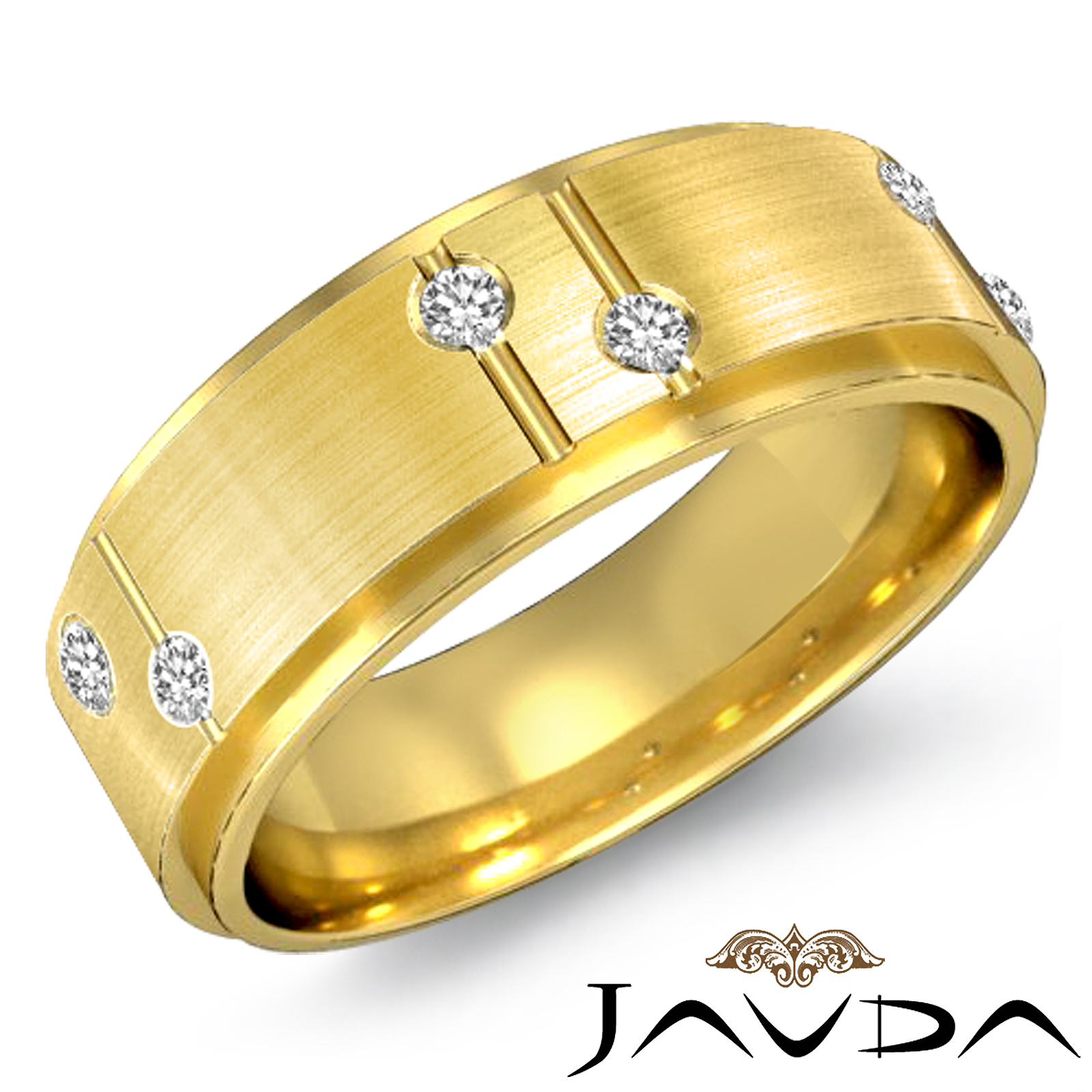 Charming diamond men's half wedding band is made from solid 18k Gold Yellow. Showcasing polished step edge and matte finish center with round bezel diamonds beautifully set on vertical grooves.