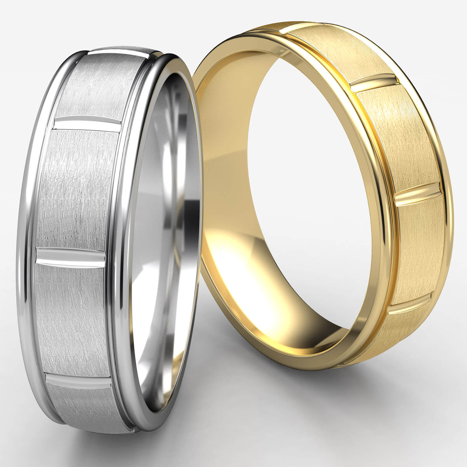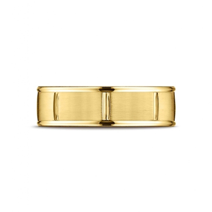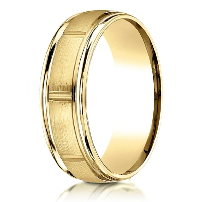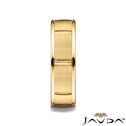 An elegant unisex comfort fit carved design wedding band features a satin finished verticle center cuts with high polished round edges. The stylish and classic gold wedding ring for men's and women's is comfortable to wear everyday. Made from quality 14k Gold Yellow, measure 7mm wide. Available in white gold, yellow gold and rose gold.