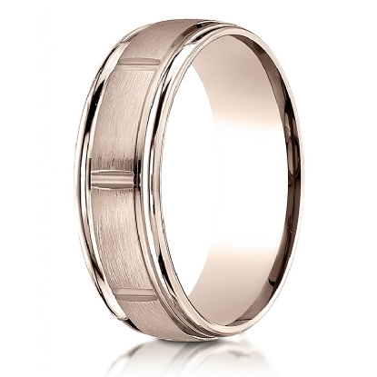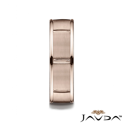 An elegant unisex comfort fit carved design wedding band features a satin finished verticle center cuts with high polished round edges. The stylish and classic gold wedding ring for men's and women's is comfortable to wear everyday. Made from quality 14k Rose Gold, measure 7mm wide. Available in white gold, yellow gold and rose gold.