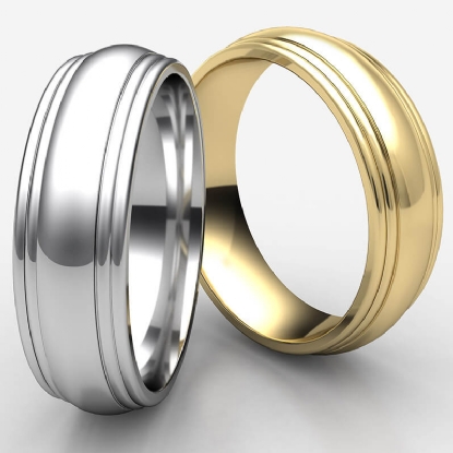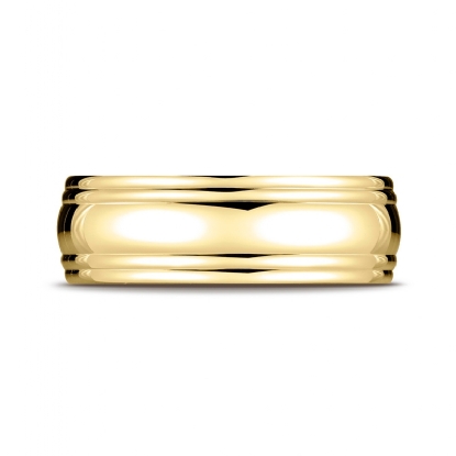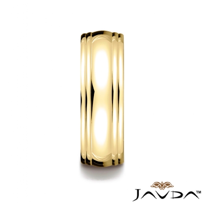 A shining comfort fit high polished carved design wedding band features a high polished finish double round edge. This classic domed handsome look wedding band is made from 14k Gold Yellow, measures 7.5mm wide. This fashionable men's wedding band is durable and comfortable to wear everyday. Available in white gold, yellow gold and rose gold.