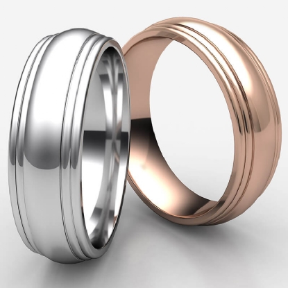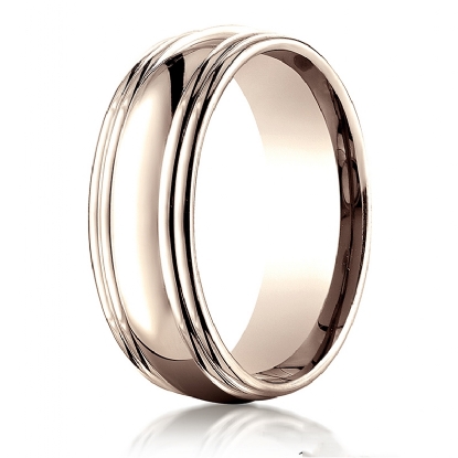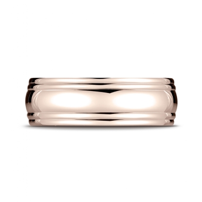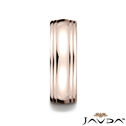 A shining comfort fit high polished carved design wedding band features a high polished finish double round edge. This classic domed handsome look wedding band is made from 14k Rose Gold, measures 7.5mm wide. This fashionable men's wedding band is durable and comfortable to wear everyday. Available in white gold, yellow gold and rose gold.