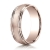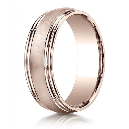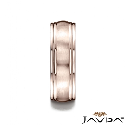 Unique comfort fit carved design wedding band features a satin finished center and high polished double round edge. This classic domed handsome look wedding band is made from 14k Rose Gold, measures 7.5mm wide. This fashionable men's wedding band is long lasting and comfortable to wear everyday. Available in white gold, yellow gold and rose gold.