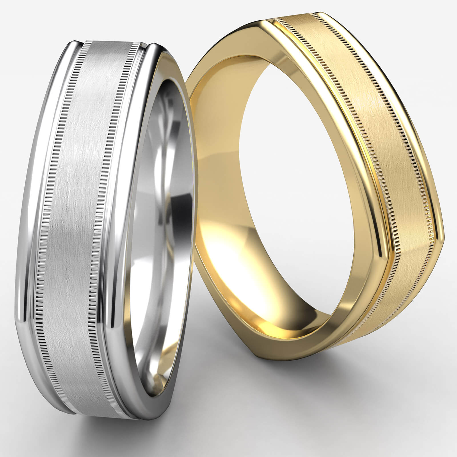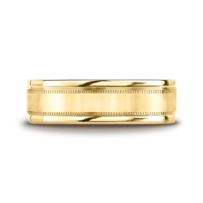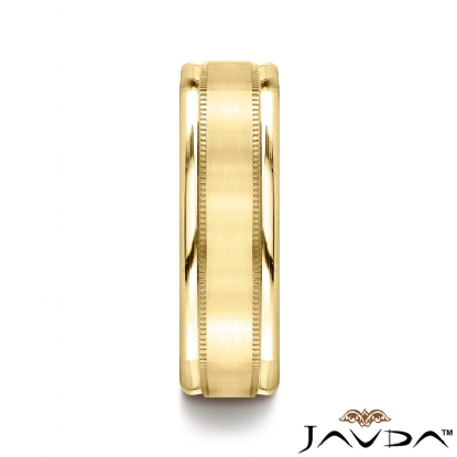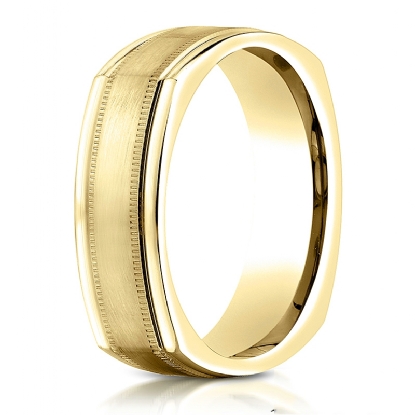 This incredible 7mm comfort fit four sided men's wedding band features a satin finished along the center with milgrain and rounded edges. This squared style carved design wedding band is comfortable to wear everyday and quality craftsmanship makes long lasting, this band is made from 14k Gold Yellow. Available in white gold, yellow gold and rose gold.