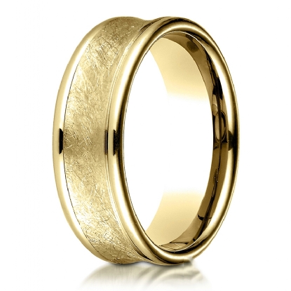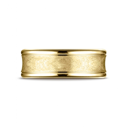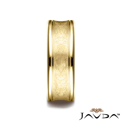 This glorious comfort fit 7.5mm carved wedding band features concave design with center swirled finished and high polished round edge. This stylish unisex wedding band is made from quality 14k Gold Yellow. The high polished round edge completes this stunning piece. Available in white gold, yellow gold and rose gold.
