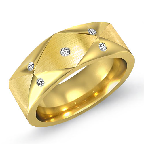 A timeless design diamond pattern men's half wedding band is crafted in 14k Gold Yellow. Featuring the combination of matte and polished finish center with round diamonds set in a bezel setting.