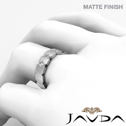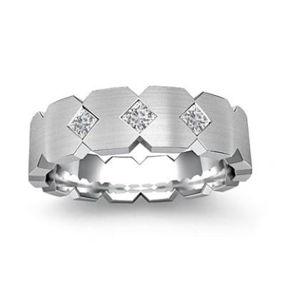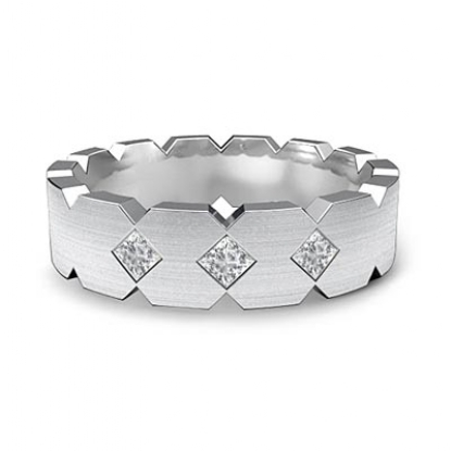 The stylish diamond men's half wedding band is made from solid 18k Gold White. This wedding ring features matte finish center and cut edges with 3 princess cut diamond in a bezel set.