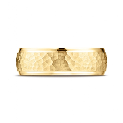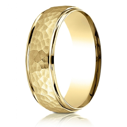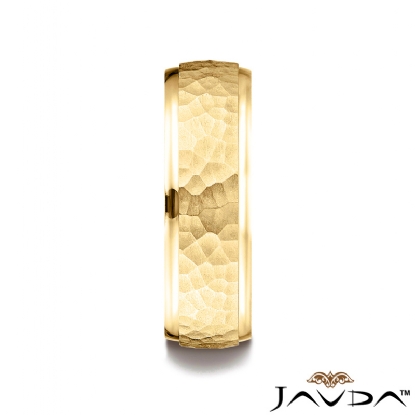 This 7mm unisex carved wedding band features a hammered finish center with high polished edges for a stylish look. This classic wedding band for men's and women's is made from 14k Gold Yellow, measures 7mm wide. A modern hammered detailing ring is comfortable to wear everyday. Available in white gold, yellow gold and rose gold.
