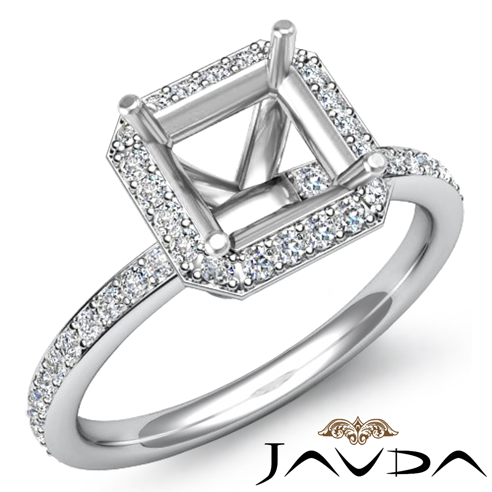 An elegant statement, this asscher diamond semi mount engagement ring captures all the romance, with pave set round diamonds in halo & on the shank. This ring is made in glorious Platinum 950 (1Ct. tw.)