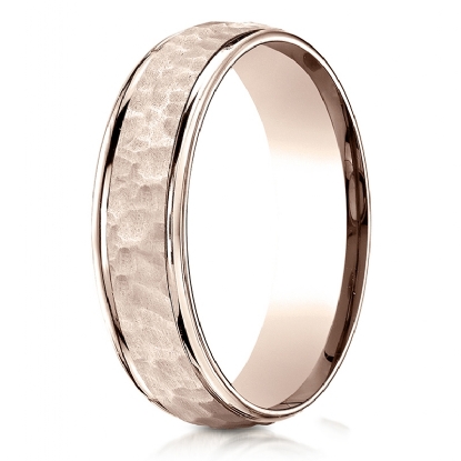 This unisex 6mm comfort fit carved wedding band features a hammered finish center with high polished round edges for a modern look. The classic wedding band is suitable for both men's and women's, made from 14k Rose Gold. A modern hammered detailing ring is comfortable to wear everyday. Available in white gold, yellow gold and rose gold.