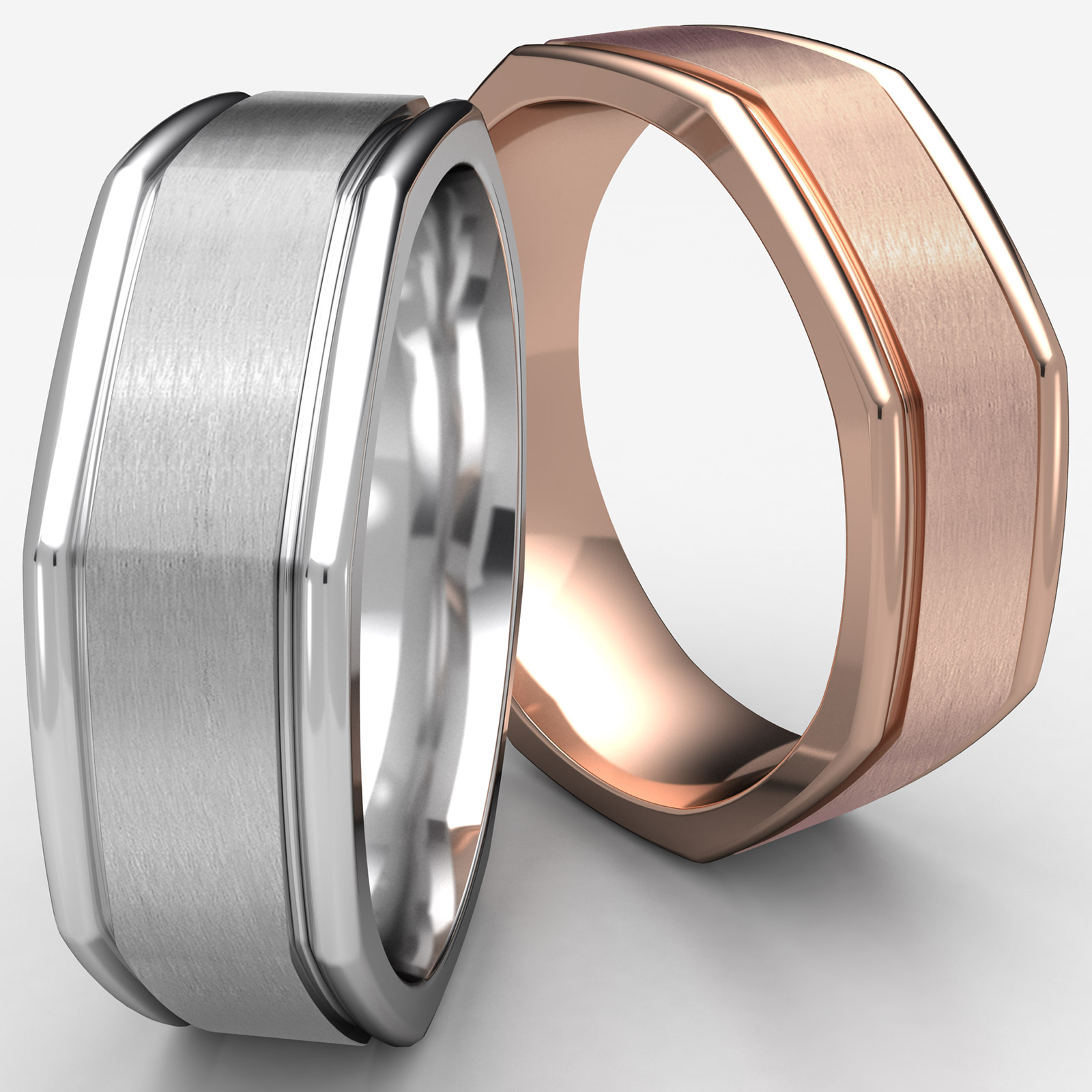 This unique unisex 8mm comfort fit carved wedding band features a satin finished center octagonal with high polished round edges for a modern look. The classic wedding band is suitable for both men's and women's, made from 14k Rose Gold. This stunning ring is comfortable to wear everyday. Available in white gold, yellow gold and rose gold.