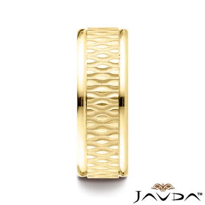 This designer unisex 8mm comfort fit carved wedding band features a bubbled pattern with high polished round edges. The stunning wedding band is suitable for both men's and women's, made from 14k Gold Yellow. This patterned ring is comfortable to wear everyday and quality craftsmanship makes long lasting. Available in white gold, yellow gold and rose gold.