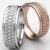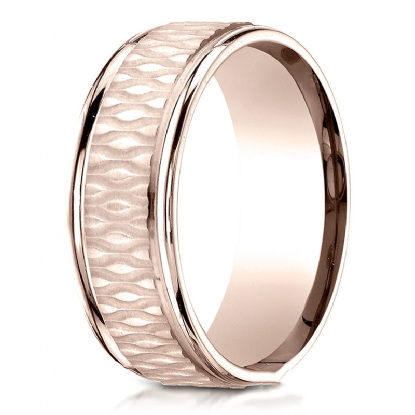 This designer unisex 8mm comfort fit carved wedding band features a bubbled pattern with high polished round edges. The stunning wedding band is suitable for both men's and women's, made from 14k Rose Gold. This patterned ring is comfortable to wear everyday and quality craftsmanship makes long lasting. Available in white gold, yellow gold and rose gold.