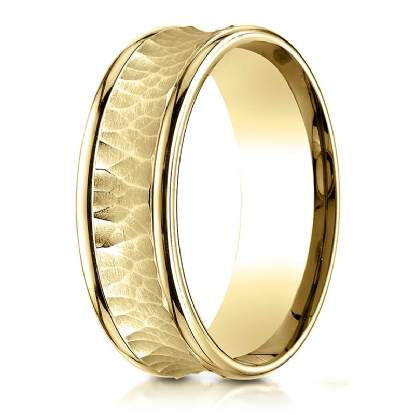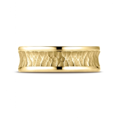 This 7.5mm unisex comfort fit carved wedding band features a hammered finished concave center design with high polished round edges. The stunning wedding band is a beautiful option for the bride and groom on their wedding day, made from 14k Gold Yellow. A modern hammered detailing ring is comfortable to wear everyday. Available in white gold, yellow gold and rose gold.