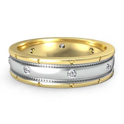 A bold and handsome design men's diamond eternity wedding band crafted in 18k Gold 2Tone. This wedding ring features yellow gold polished edges and white gold center dome with round cut diamonds in a bezel set.