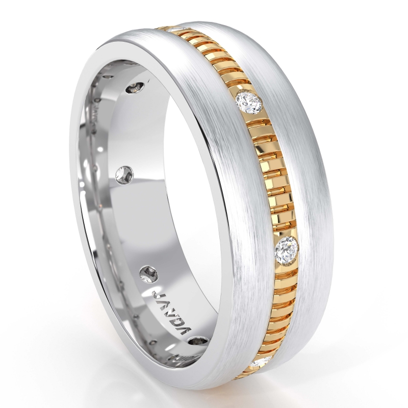 This stunning men's diamond eternity wedding band is made from 18k Gold 2Tone. The timeless gold ring features white gold dome edges and vertical cuts in yellow gold with round diamonds set in a bezel setting. Available in 14k & 18k 2 tone gold. (0.16Ct. tw.)