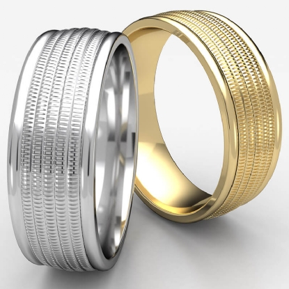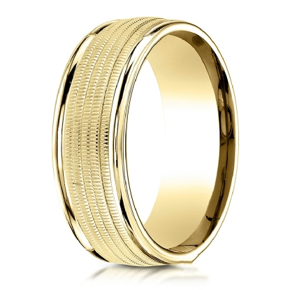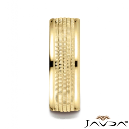 This stylish 8mm comfort fit carved design unisex wedding band features a milgrain center with high polished round edges. This stunning solid wedding band for men's and women's is comfortable to wear everyday and quality craftsmanship makes this long lasting band a great value. Made from 14k Gold Yellow. Available in white gold, yellow gold and rose gold.