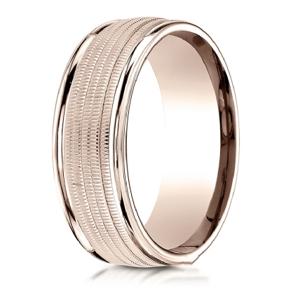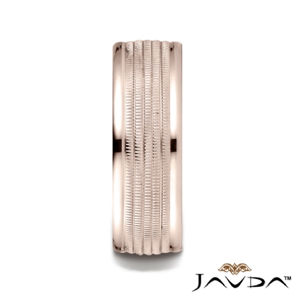 This stylish 8mm comfort fit carved design unisex wedding band features a milgrain center with high polished round edges. This stunning solid wedding band for men's and women's is comfortable to wear everyday and quality craftsmanship makes this long lasting band a great value. Made from 14k Rose Gold. Available in white gold, yellow gold and rose gold.
