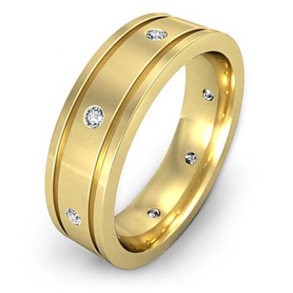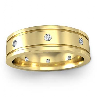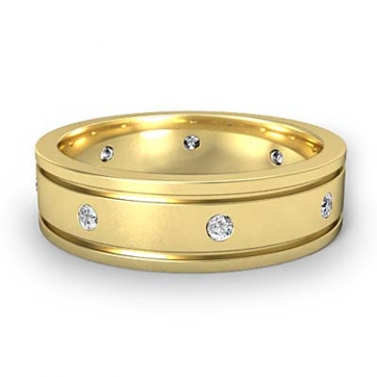 A stylish diamond eternity men's wedding band crafted in 14k Gold Yellow. Featuring highly polished flat edges with round diamonds set in a bezel setting.