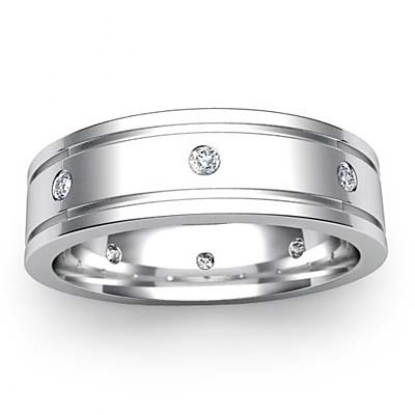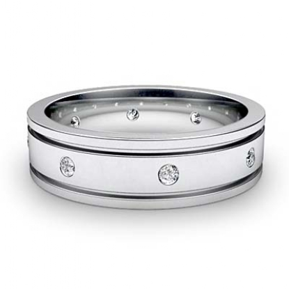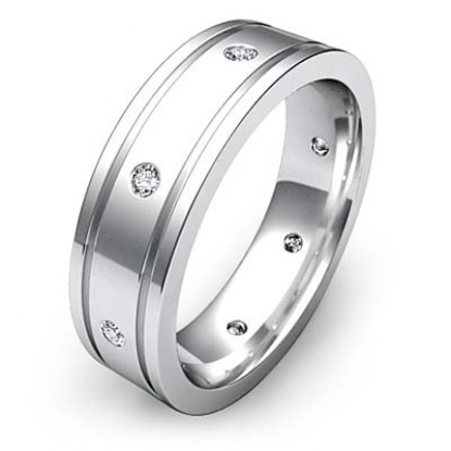 A stylish diamond eternity men's wedding band crafted in 18k Gold White. Featuring highly polished flat edges with round diamonds set in a bezel setting.