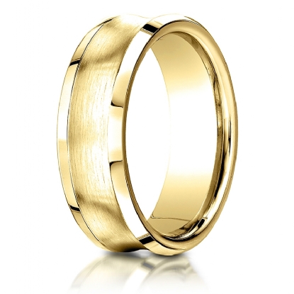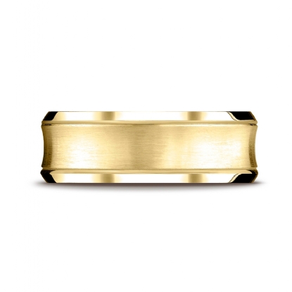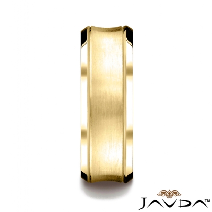 This classic and stylish comfort fit satin finished unisex wedding band features a concave center and beveled edges. This charming and modern wedding band for men's and women's is long lasting and perfect for everyday wear. Made from 14k Gold Yellow, measures 7.5mm wide. Available in white gold, yellow gold and rose gold.