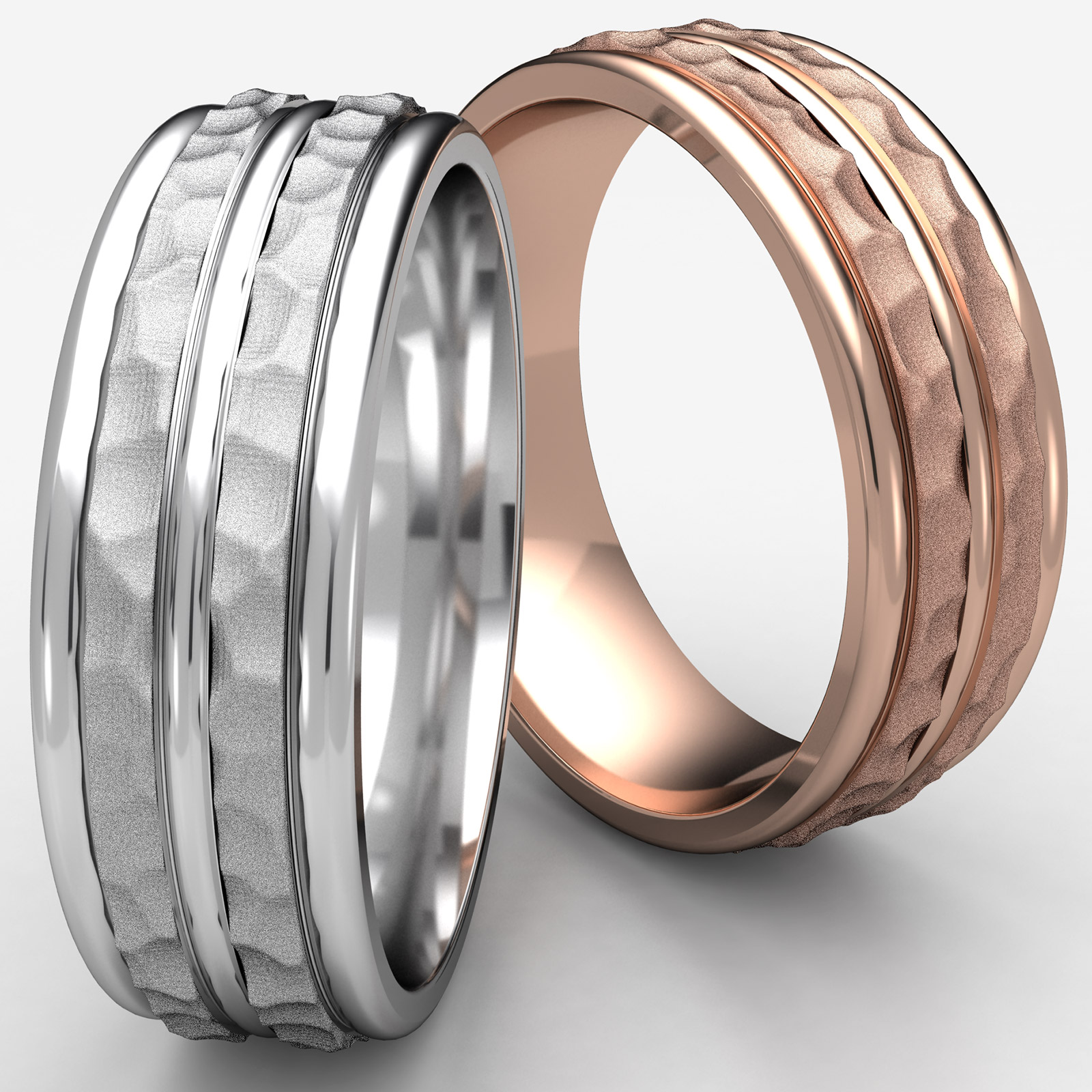 This glorious comfort fit unisex wedding band features a hammered finish center cut with polished round edges. This modern solid wedding band for men's and women's is comfortable to wear everyday and quality craftsmanship makes this long lasting band a great value. Made from 14k Rose Gold, measures 8mm wide. Available in white gold, yellow gold and rose gold.