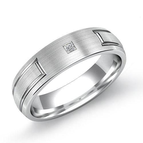 The grooved design men's diamond wedding band made from 18k Gold White. This solid gold ring features matte finish with 1 princess diamond in a bezel set.