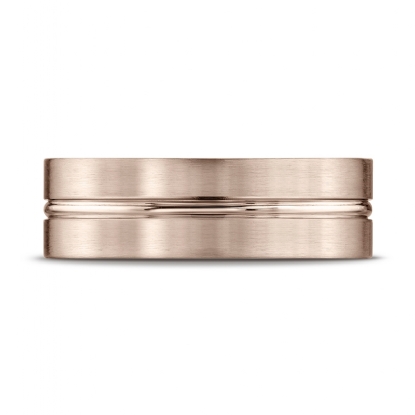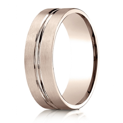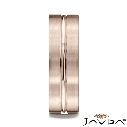 This stunning handsome satin finished comfort fit carved design wedding band features a high polished center cut. The quality men's solid gold ring is durable and comfortable to wear everyday. Made from 14k Rose Gold, measures 7mm wide. Available in white gold, yellow gold and rose gold.