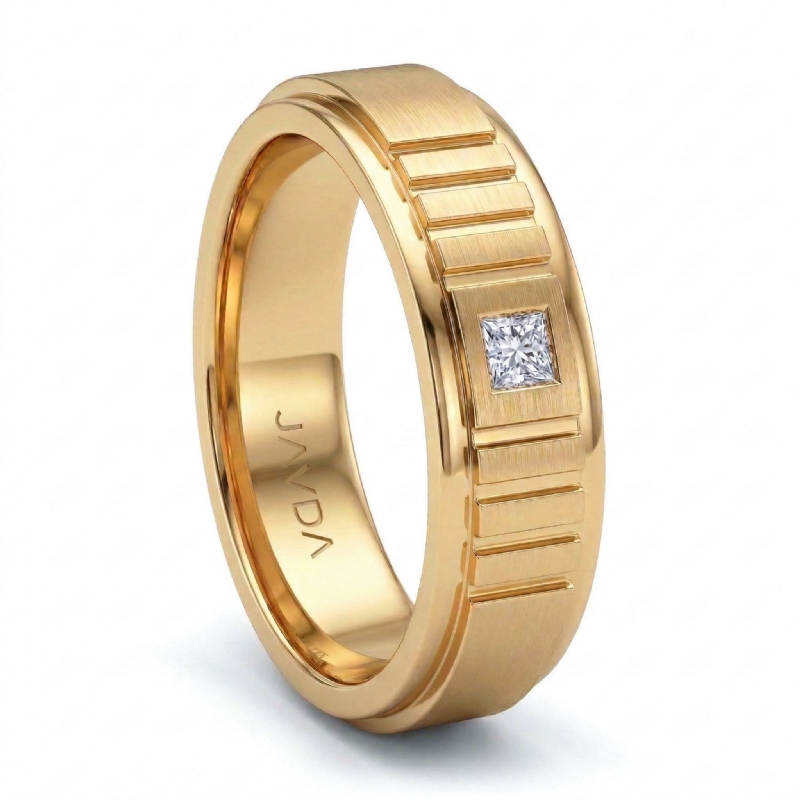 The affordable men's diamond wedding band made from 14k Gold Yellow. This gold wedding ring features matte finish center and polished round edges with princess diamond in a bezel set.