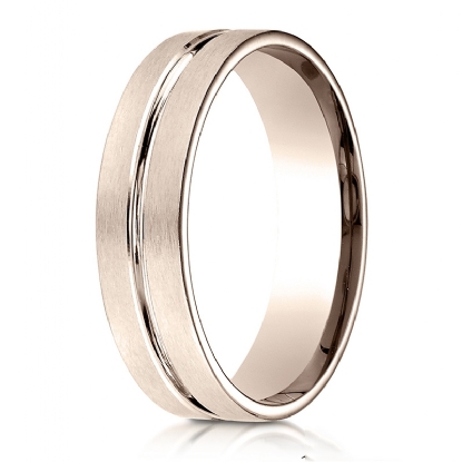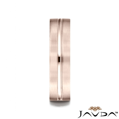 This timeless men's comfort fit satin finished carved design wedding band features a high polished center cut. The handsome solid gold ring is long lasting and perfect for everyday wear. Made from quality 14k Rose Gold, measures 6mm wide. Available in white gold, yellow gold and rose gold.