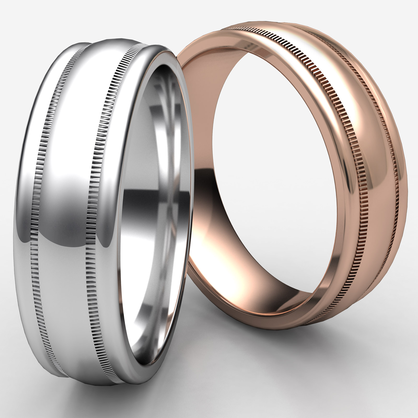 This classic 7.5mm wide men's comfort fit carved design wedding band features a high polished finished domed and milgrain along with round edges. The handsome solid gold ring is long lasting and perfect for everyday wear, made from quality 14k Rose Gold. Available in white gold, yellow gold and rose gold.